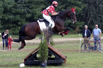 Die sehr schön gebaute Geländestrecke und die sehr guten Bodenverhältnisse erlaubten es dann unter hervorragenden Bedingungen die letzte Disziplin zu absolvieren. Von Beginn weg mit raumgreifender Galoppade unterwegs, liessen Brigitte und Lara nichts mehr anbrennen. Einzelsprünge nahm Lara oft fast einen Galoppsprung zu früh und bei den Kombinationen hatte Brigitte stets alles unter Kontrolle, so dass alles wie geplant geritten werden konnte. Die letzten zwei Sprünge absolvierte das Paar mit nur einem Steigbügel, da Brigitte den Anderen kurz davor aufgrund eines Stolperers verloren hatte. Aber auch dies konnte die beiden nicht daran hindern ohne Fehler und in der Zeit ins Ziel zu kommen, was nur gerade 11 Paaren gelang. Brigitte beendete damit diese Prüfung auf ihrem Dressurergebnis und dem daraus folgenden hervorragenden 2. Rang.